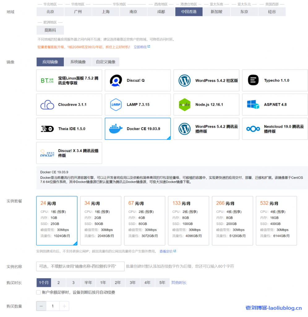 首先在腾讯云官网购买一台轻量应用服务器,选择 Docker 镜像,这样我们只需安装 docker-compose。
