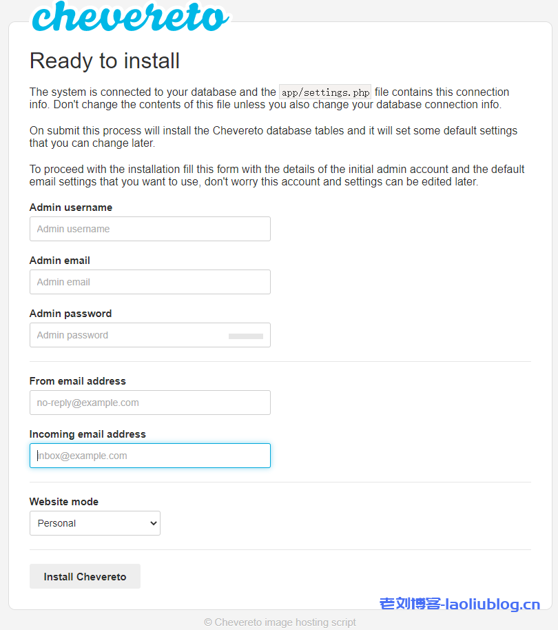 在浏览器里访问轻量应用服务器的IP,会打开 chevereto 首次安装后的配置页面,输入相关信息后,点击「Install Chevereto」按钮。