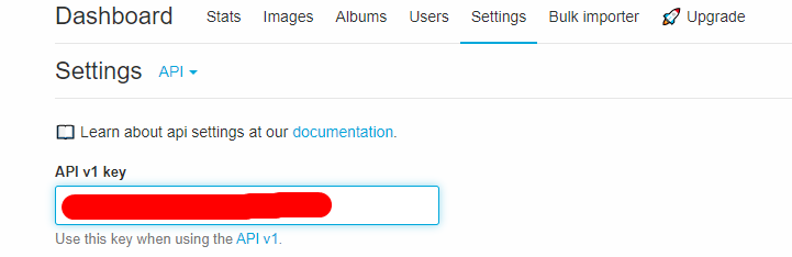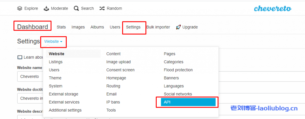 登录以后我们要获取 Chevereto 的API key:在Dashboard->Settings->Website->API