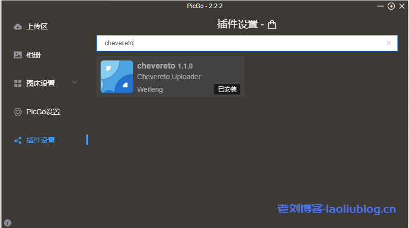 打开 PicGo 后,在插件设置中搜索 Chevereto 安装即可。
