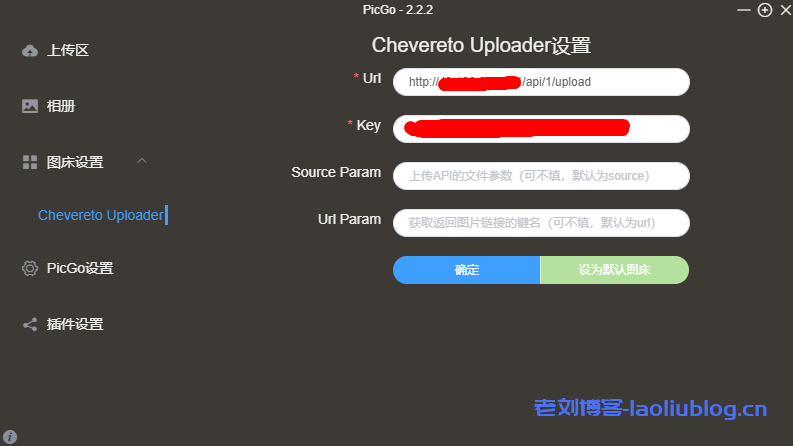 这里我们要配置Chevereto上传的Url(Url为http://ip/api/1/upload)和之前在 chevereto Dashboard 中获取到的 API v1 key。这样 PicGo 就可以自动将图片上传到 Chevereto 了。