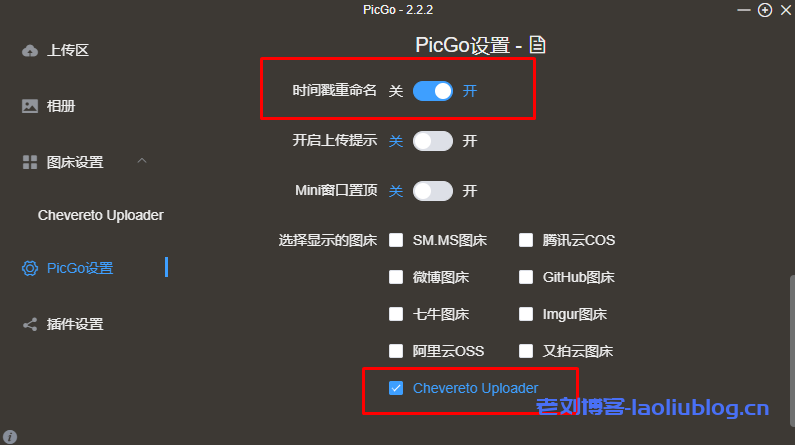 在 PicGo 设置中开启时间戳重命名,防止多次上传相同文件报错。同时我们取消其它不使用的图床,只显示 Chevereto Uploader。