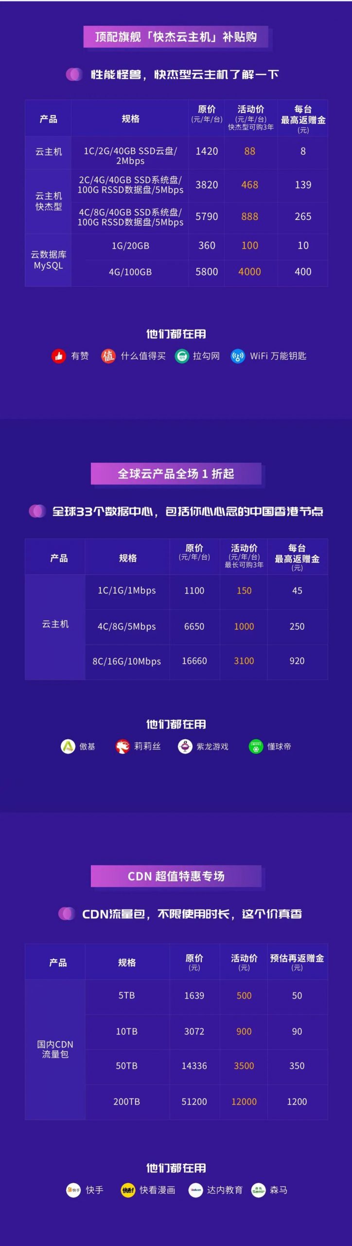 活动原则:产品适用于文件下载加速、网站静态内容加速、音视频点播等业务,加速范围:中国大陆、港澳台地区及海外,各规格限购1个;