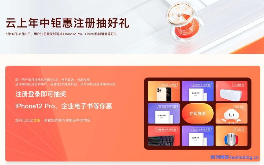 活动期内(2021.7.26 16:00:00—2021.8.31 23:59:59),用户在阿里云官网完成登录即可在活动页面参与抽奖。同一用户每日抽奖机会默认1次,当日有效,过期作废。活动期间新注册的用户,另赠送1次抽奖机会,该中奖机会活动期间有效。