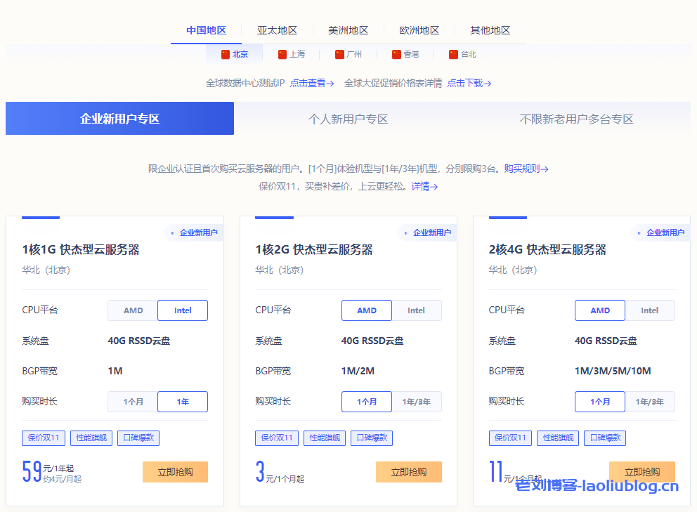 企业新用户专区:限企业认证且首次购买云服务器的用户。[1个月]体验机型与[1年/3年]机型,分别限购3台。