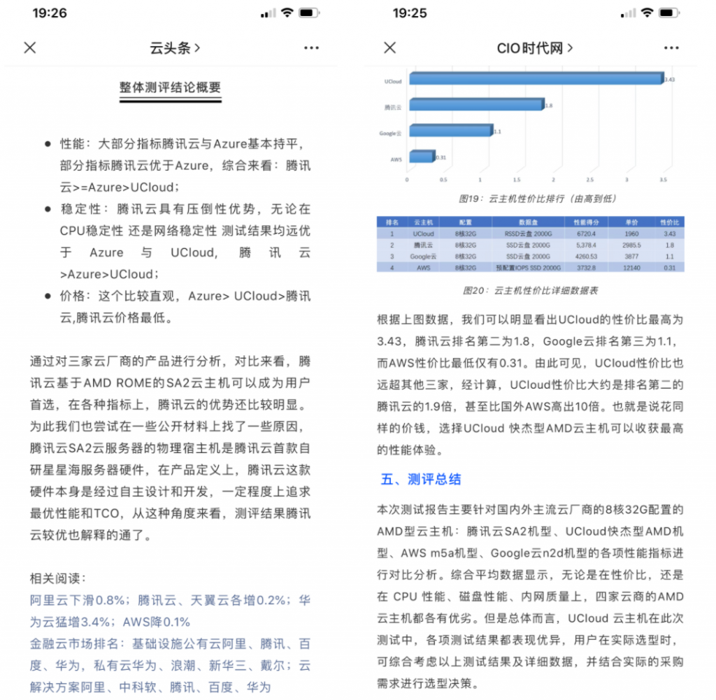 5月27日,云头条有发布过一篇《腾讯云 vs Azure vs UCloud:基于AMD EPYC™ ROME云主机选型指南》,此文为一开发者测评数据,投稿发布;同日CIO时代网也同样发布了一篇《高性能AMD云主机如何选?AWS、谷歌云、UCloud、腾讯云测试大PK》的测评文章。