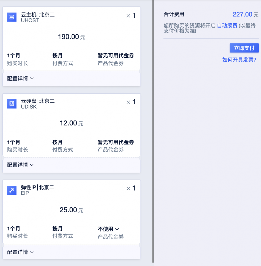 在价格查询时,我们发现,由于进入UCloud主机创建页时,若不调整选项,默认带1Mb外网带宽和20GB数据盘,三个配置项叠加的总价和《选型指南》表中展示的一致。以2核8G举例,227元/月正是在《选型指南》列出的UCloud快杰型价格。