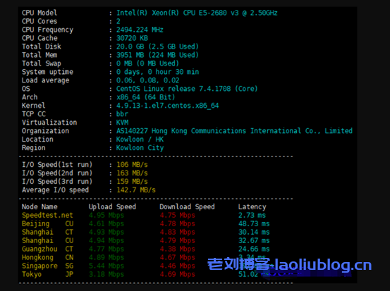 1、华纳云香港云服务器硬件及上传下载速度测试