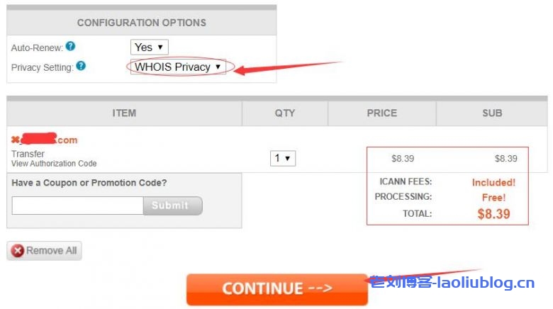 3.进入转移域名续费页面(一般转移域名都需要在迁移目的域名商这里续费一年),我们勾选免费赠送的隐私协议(默认没有的哦),然后点击续费,下单就可以了。