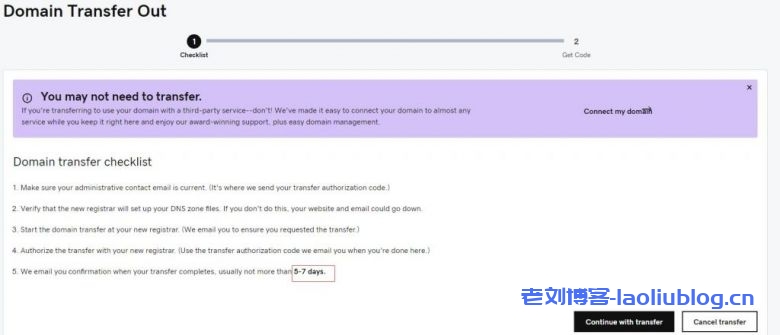 4.进入转移域名设置页面,同意协议,并且可以看到提示,通常迁移需要5-7天时间完成迁移。点击 “ Continue with transfer ”进入下一步,如图