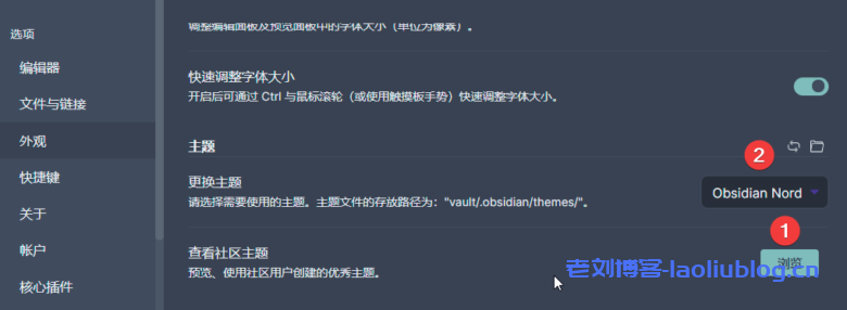 如果您不喜欢Obsidian默认主题,可以打开设置 – 外观主题 – 查看社区主题,并进行设置,如下图。