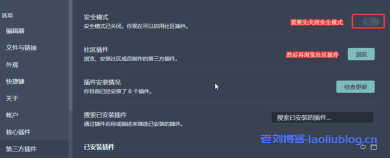 Obsidian支持丰富的第三方插件,可以扩充Obsidian功能,不过要先在设置 – 第三方插件 – 将安全模式先关闭,然后再浏览社区插件。