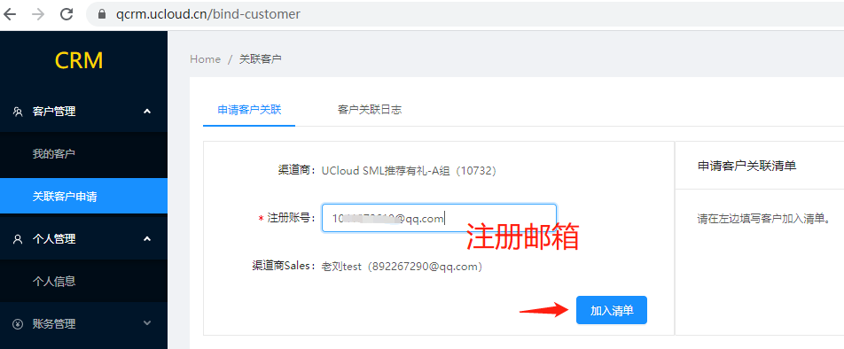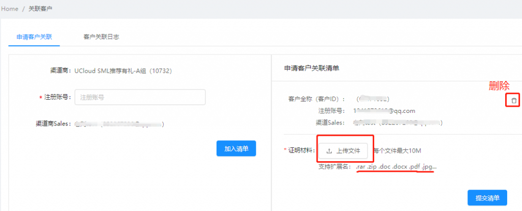 3,输入注册账户,点击“加入清单”后,上传证明材料,以证明这是我们推荐来的客户,证明材料格式包括压缩文件,文档和图片等。官方说只要材料能证明给客户发过我们的推荐链接以及客户把他的账号发了给你就可以说明是我们的客户了(这意思就是你开通推荐链接肯定是在客户注册账户时间之前)。提交证明材料清单后,等待UCloud工作人员审核通过或拒绝。