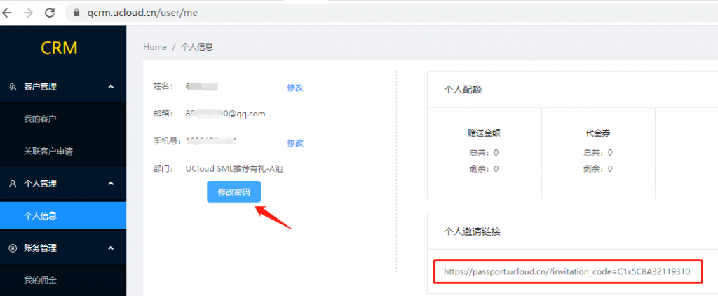 2,系统界面页,可以看到有客户管理(我的客户、关联客户申请、首日订单),个人信息(个人信息)和财务管理(我的佣金)[ 财务管理(我的佣金) 暂未开放]。进入个人信息可以看到自己的个人配额(忽略,不需要看这个)和个人推荐链接(和邮件给到的邀请链接一致),和“修改密码”按钮,点选进行修改登陆密码。这里也可以修改姓名和绑定的手机号。