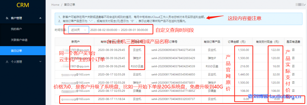 补充内容:老刘博客注意到,上周五UCloud他推荐系统已经上线了我的客户-首日订单查看功能。咨询了UCloud工作人员,其显示的数据解释如下: