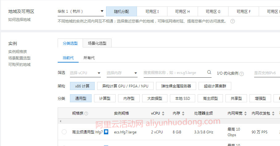 2、选择阿里云服务器的地域、实例规格、操作系统等。
