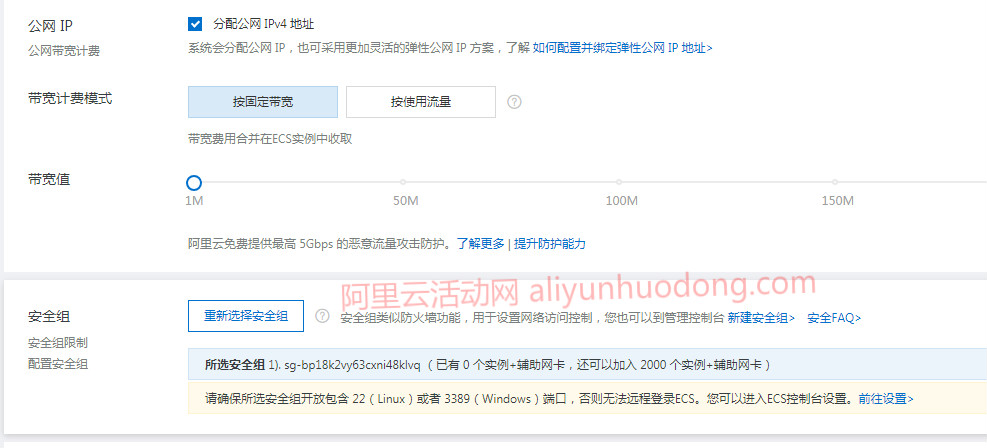 3、选择阿里云服务器带宽,设置安全组信息。