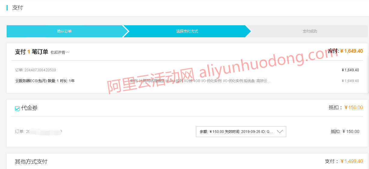 4、最后在结算订单时,系统会自动根据订单金额匹配可使用代金券金额,我们只需勾选使用面额最大的代金券即可,例如小编所下单的阿里云服务器订单价格为1649.40元,使用150元代金券之后,实际需支付的订单的金额就变成了1499.40元,如下图所示: