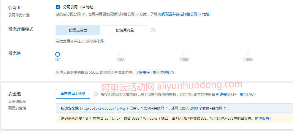3、选择阿里云服务器带宽,设置安全组信息,如下图所示: