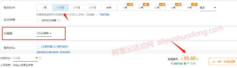优惠券的使用流程跟代金券是差不多的,一样是通过阿里云活动或者云产品页下单购买,最后支付订单的时候,选择使用优惠券即可。例如小编在金秋上云季注册抽好礼活动中领取了一张10元的优惠券,购买了一台订单金额为105.60元的月付云服务器产品,就可以使用这张10元的优惠券,实际订单金额就变成了95.60元了,如下图所示: