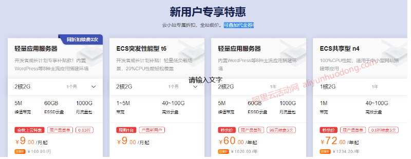 领取阿里云代金券之后,推荐大家通过云小站平台的新用户特惠专区直接购买阿里云产品,此专区内的云产品配置和价格都是阿里云当下各个促销活动中的爆款配置,省去大家再去找其他活动的时间,更重要的是云小站新用户特惠专区内的云产品可叠加代金券使用,能够让大家领取了还用得上。
