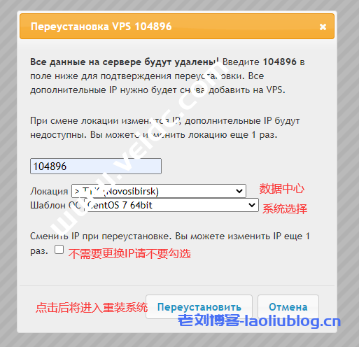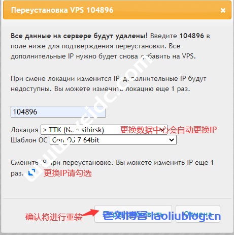如果只是重装系统,无需更换数据中心和IP,请保持下图选项即可:
