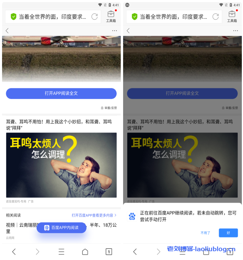可以看到,百度给里面加了一个自己的内容:[Baidu; P1 11],而使用这个UA访问,却不会提示在APP中打开。