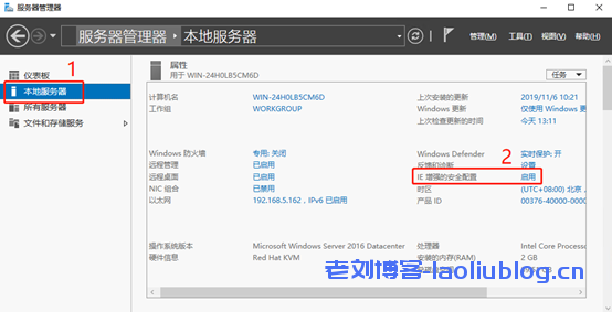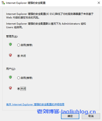 - 【IE增强的安全配置】,分别在管理员和用户选择【关闭】,点击【确定】按钮,关闭后返回【服务器管理器】查看IE增强的安全配置是否【关闭】。