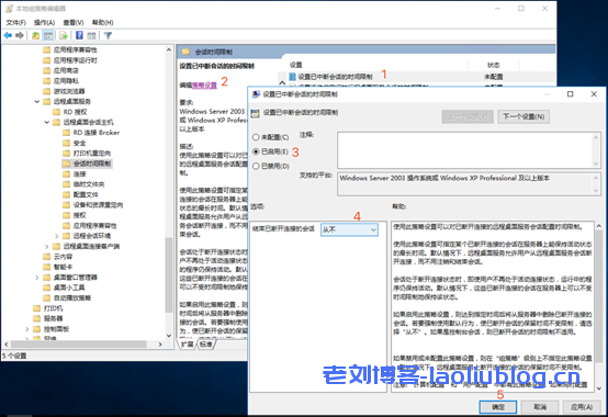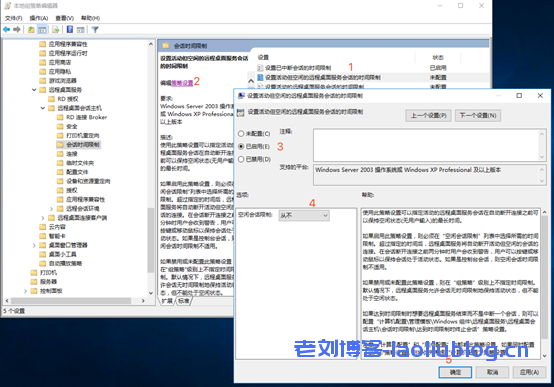 - 单击【设置活动但空闲的远程桌面服务会话的时间限制】,再点击【策略设置】,选择【已启用】,选项选择【从不】,点击【确定】确认。