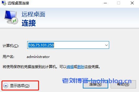 - 打开【远程桌面连接】,选择左下方倒三角【显示选项】。