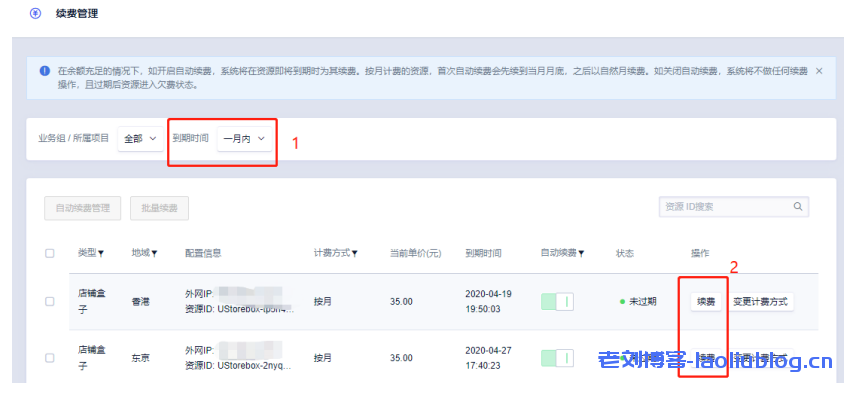 2. 在续费管理页面,选择到期时间 1 个月内的资源,点击续费,选择续费时长,充值完成续费。