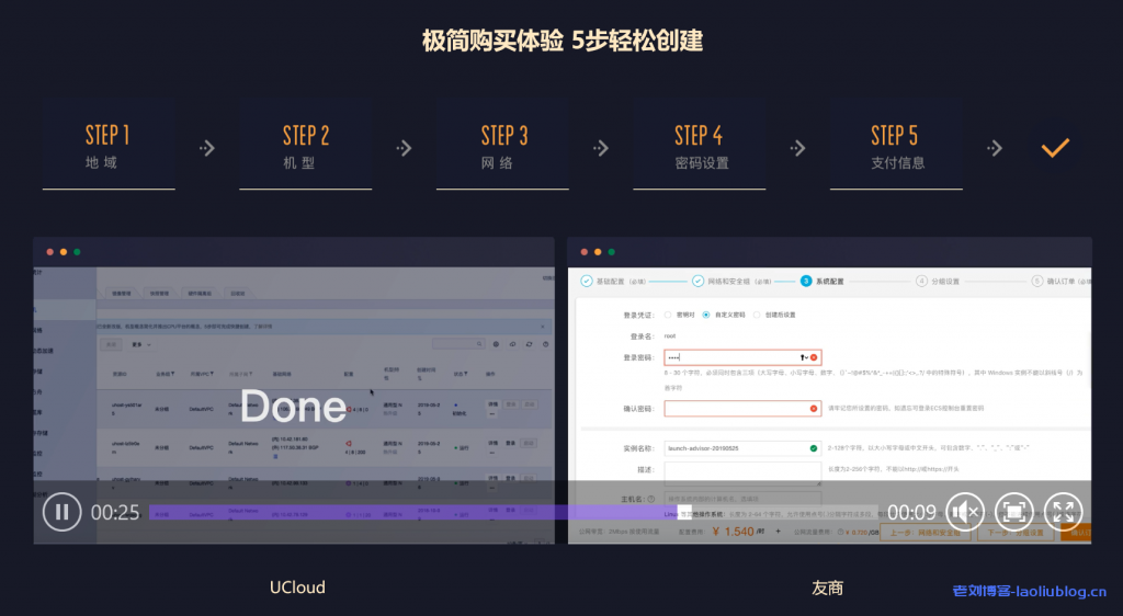 老刘今天在UCloud优刻得官网英特尔快杰云主机产品介绍页面,看到有意思的云服务器购买下单流程对比视频。页面描述是UCloud通用型N云主机和友商计算型c5云服务器购买步骤,从视频展示出的友商机器命名:计算型c5和控制台界面,应该展示的是阿里云得云服务器产品。