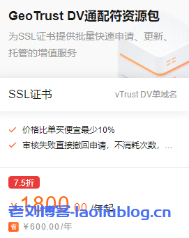 最新优惠折扣及价格:SSL证书 vTrust DV单域名,7.5折,1800.00/年起。