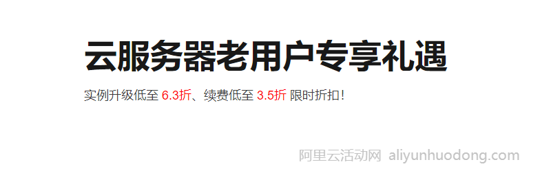 在此活动中,阿里云会有实例升级低至 6.3折、续费低至 3.5折 限时折扣,还会不定期推出新购折扣优惠的优惠,同一用户仅限参与1次,仅限1台实例参与续费。活动地址:云服务器老用户专享礼遇
