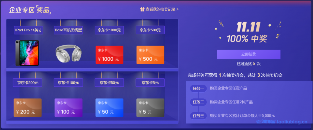 iPad Pro、Bose耳机、京东卡等你来抽。完成任务可获得 1 次抽奖机会,共计3次抽奖机会,100%中奖,立即前往>>: