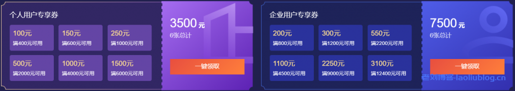 个人用户专享券6张共计3500元,企业用户专享券6张共计7500元:
