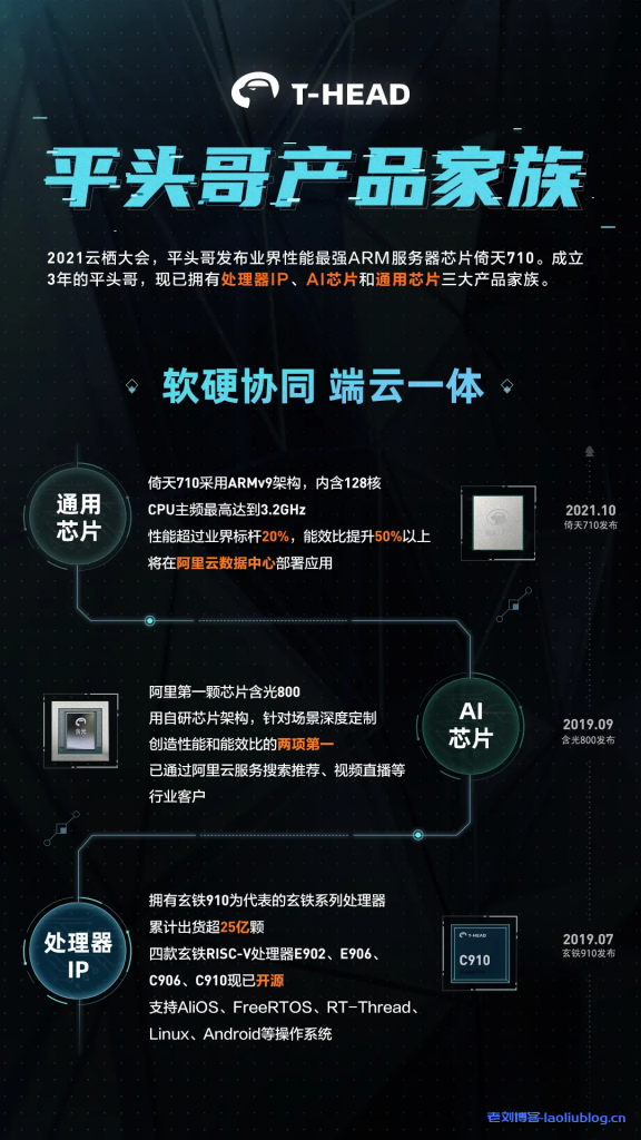 随着倚天710的发布,平头哥已拥有处理器IP、AI芯片及通用芯片等产品家族。其中,玄铁系列为AIoT终端芯片提供高性价比IP;AI芯片含光800通过阿里云为人工智能场景提供极致AI算力;通用服务器芯片倚天710则通过阿里云为云上客户提供差异化的顶级算力。