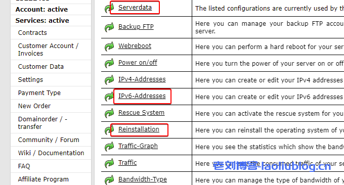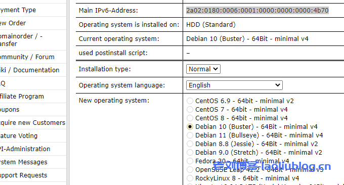 在EUserv免费VPS控制面板中,主要有查看VPS信息、重装系统以及IPv6地址等功能。