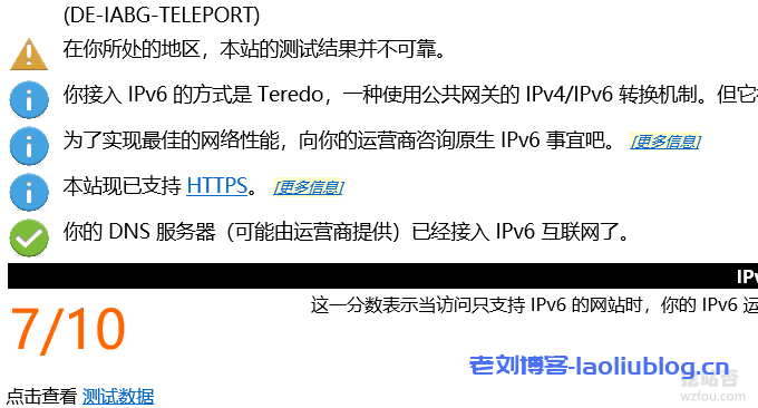 启动 IE 浏览器,访问 http://test-ipv6.com 或 http://ipv6.test-ipv6.com,如果选项卡 “测试项目” 下面的 “不使用域名的 IPv6 测试” 显示成功,则隧道建立成功。
