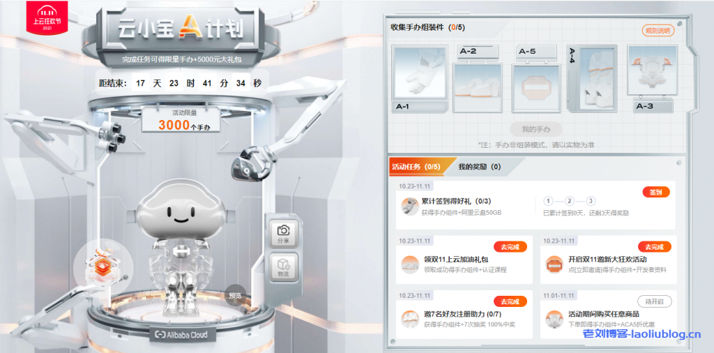 阿里云今年的双11活动【阿里云11.11上云狂欢节2021】算是已经开启了,目前为预热阶段,正式云产品购买时间是从11月1日开始,除了前文介绍的阿里云双11上云加油包(见《阿里云双11上云加油包:亿元上云加油包来袭,个人最高立减300元,企业最高立减1111元!》),阿里云还首发手办礼:云小宝A计划活动,完成5项任务可得限量3000个手办+5000元大礼包。