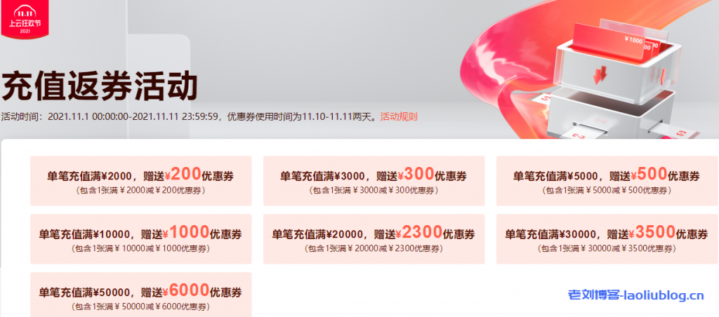 阿里云双十一优惠活动已开启,云服务器价格便宜2核2G配置5M带宽60元一年,可以领取代金券,参与充值满返代金券活动,使用购物车结算满减活动,根据消费金额抽奖活动等,不只是云服务器,阿里云CDN、短信验证码、对象存储OSS、云数据库、阿里云商标等均有双11活动价,全年最低价,最适合采购的节日。一起狂欢起来!!!