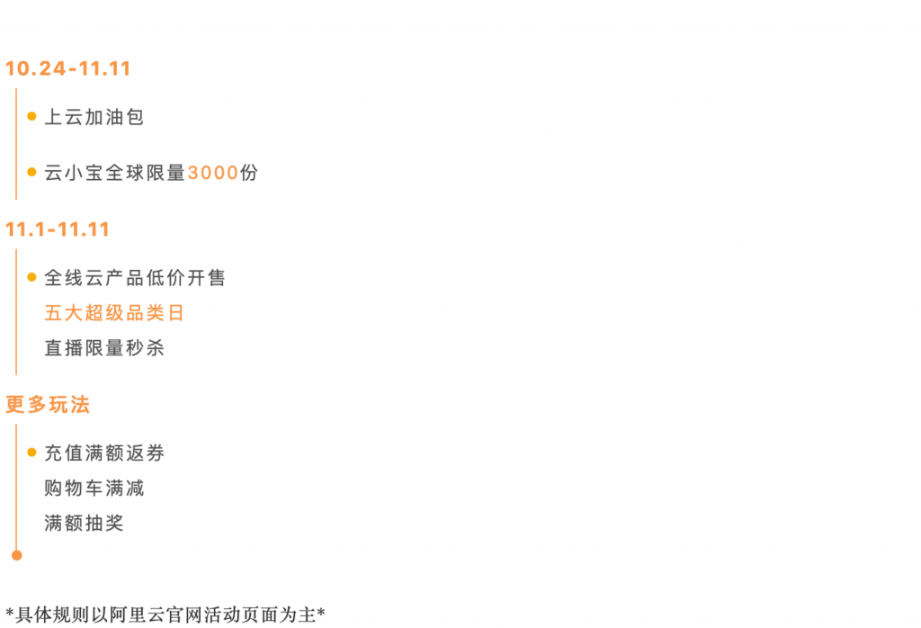 从活动页面来看,阿里云双11上云狂欢节活动分为三个阶段: