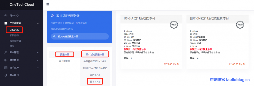 OneTechCloud双11钜惠购买图示:注册登录控制台→订购产品→云服务器→双11活动云服务器/日本CN2。