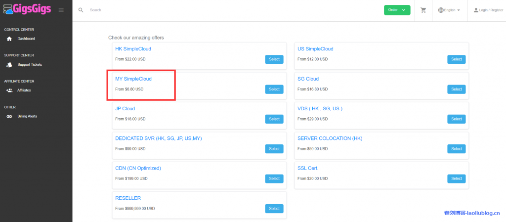 购买示意:点击上面链接,选择下图红框“MY SimpleCloud”即可进入购买GigsGigsCloud全新马来西亚VPS界面。