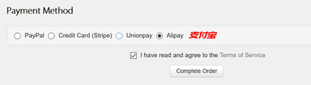 我们可以看到可以用支付宝付款。勾选条件,Complete Order,然后我们会看到付款界面,同时再确认选择支付宝付款方式,点击按钮去付款。