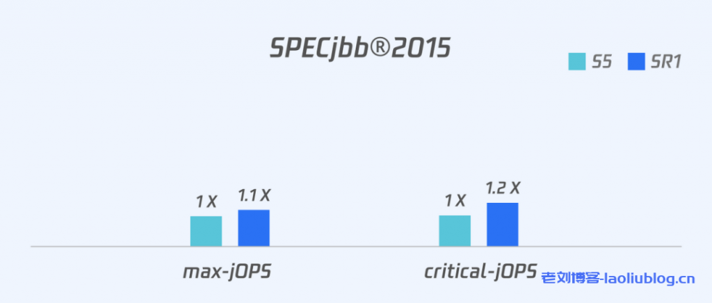 选择 SPEC CPU®2017 中的 AI 推理性能指标。deepsjeng_r ( alpha-beta 树搜索 ) 基于 2008 年世界计算机速度国际象棋冠军 Deep Sjeng WC2008,专注于获得尽可能高的演奏强度;Leela_r ( 蒙特卡洛树搜索 ) 是一个围棋引擎,具有基于蒙特卡罗的位置估计、基于置信度上限的选择性树搜索和基于 Elo 评级的移动估值。本次测试在相同规格的 SR1 和 S5 实例下进行。