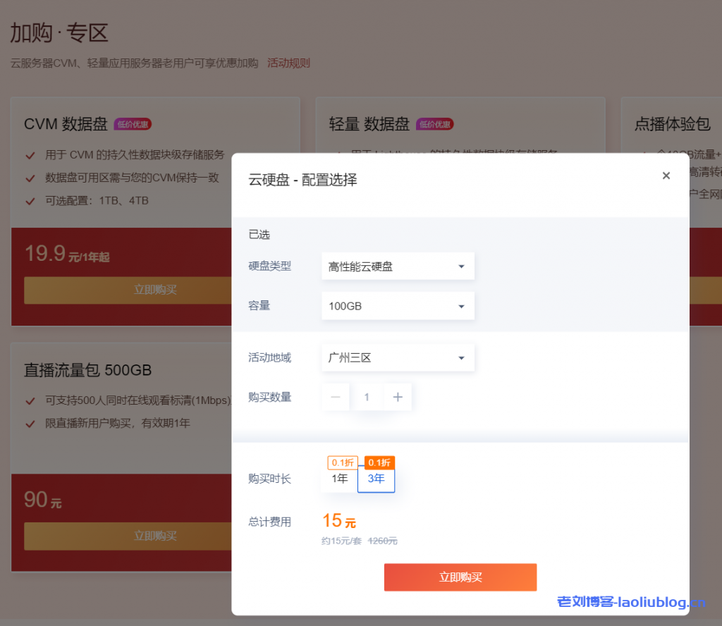 腾讯云新春采购可选CVM数据盘和轻量数据盘,其中轻量数据盘100G,3年仅需15元。