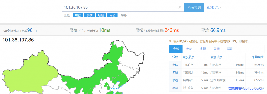 Ping测试国内三网连通性,可以看到最快广州节点延时10ms,最慢江苏泰州243ms,平均延时66.9ms。对有免备案需求,用户又在国内的朋友们,采购该机器很适合。