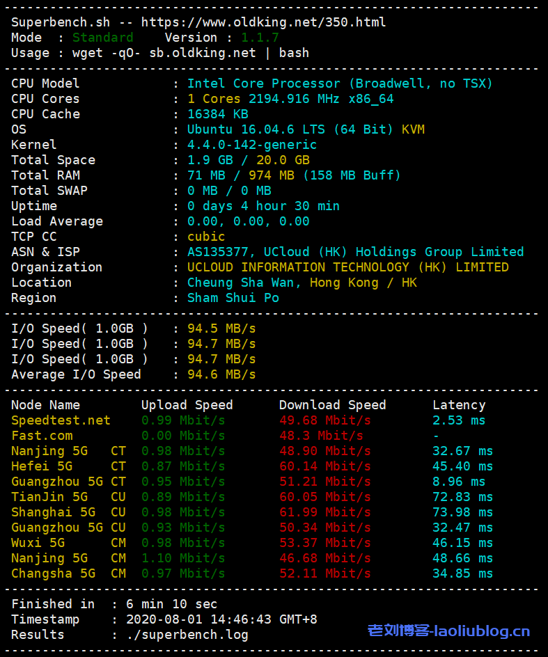 SuperBench脚本测速: 香港服务器基本信息,包括CPU型号,核数,内存,系统等信息,与选购显示信息一致。此次测试的该配置UCloud香港云主机I/O读写速度在94.6MB/s左右,读写性能不错。同时测试了到国内节点的网速,整体来看上行和下行带宽可以跑满,延时3-40ms左右,国内用户访问该机器搭建的网站可谓超低延时。
