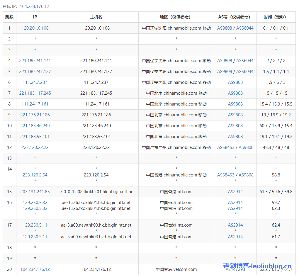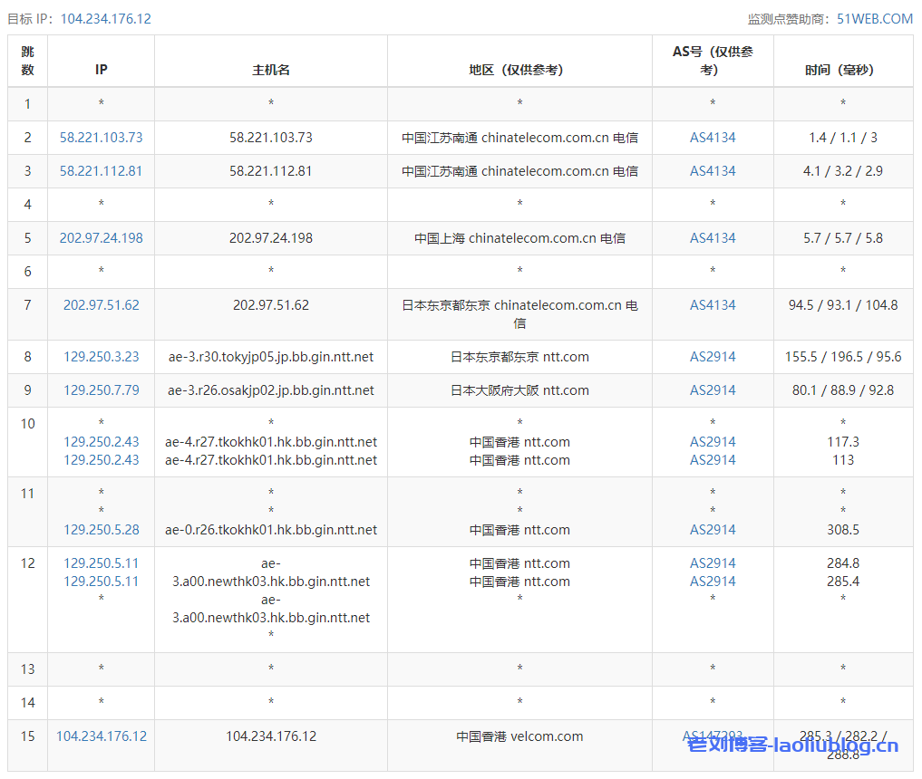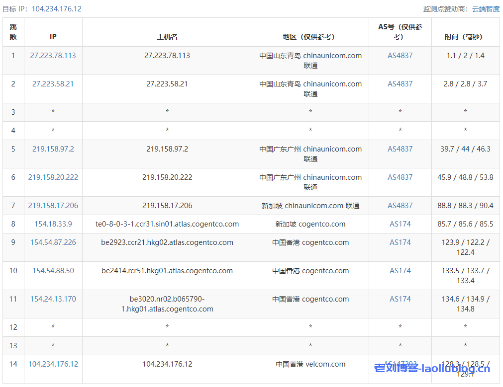 分辨是否为BGP线路我们需要使用“路由跟踪”来确定,原理就是BGP的特点,用户使用不同的网络访问都会通过相对应运营商的骨干网。测试确为三网BGP国际线路,路由如下: